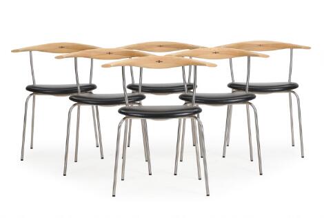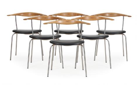 2603/518AarhusHans J. Wegner: "PP 701". A set of six armchairs with chromed steel frame and oak back. Seats with black leather. PP Møbler. (6)