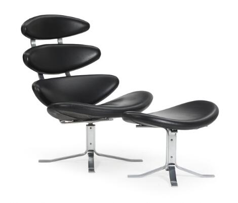 2603/539AarhusPoul M. Volther: “Corona”. Lounge chair with steel frame and matching stool. Upholstered with black leather. (2)