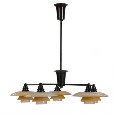 2603/515AarhusPoul Henningsen: "PH-Cup". Five armed chandelier with browned brass frame, with 2/1 shades of yellow frosted glass.