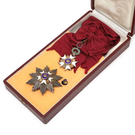 2545/5273Belgien, Kroneordenen, Storkors, bryststjerne, bånd og tegn i sølv, forgyldt og emalje, i original æske fra P. De Greef