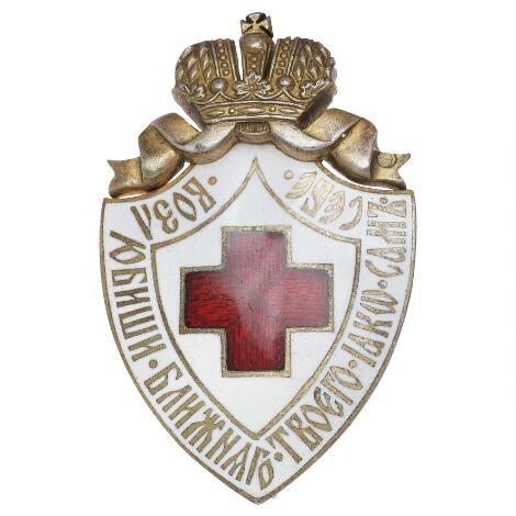 2549/5327Russia, Red Cross badge by Eduard, gilt silver and enamel, kokoshnik and makers mark on rev.