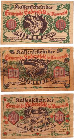 2549/5431Østrig, Hadersfeld, nødpenge i træ, 10, 20, 50 Heller 1920, i alt 3 stk.