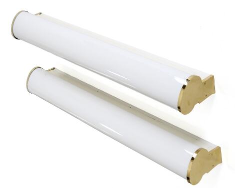 2549/1003Lyfa design: Par væglamper af hvid plast med cylindriske lampeskærme af opalglas. Lyfa. Ca. 1940. L. 19,5. (2)