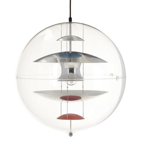 2550/600Verner Panton: “VP Globe 50”. Pendel med skærm af akryl, indvendigt ophæng med aluminiumsskærme. Diam. 50.