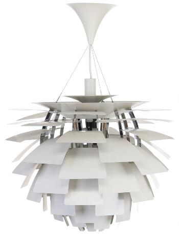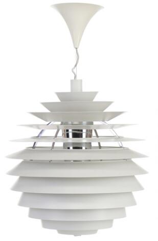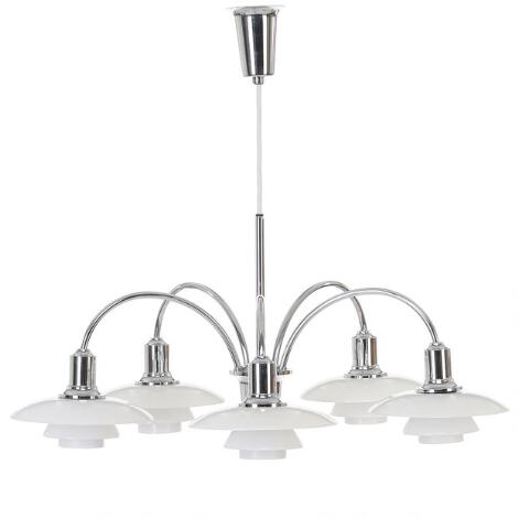 2549/1018Poul Henningsen: "PH-2/1 Bombardement". Lysekrone af forkromet metal. Skærme af flerlags opalglas.