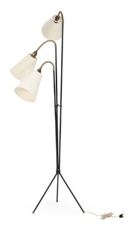 2549/934Dansk design: Standerlampe af sortlakeret metal og messing med tre justérbare arme. 1950'erne. H. 170-215 cm.