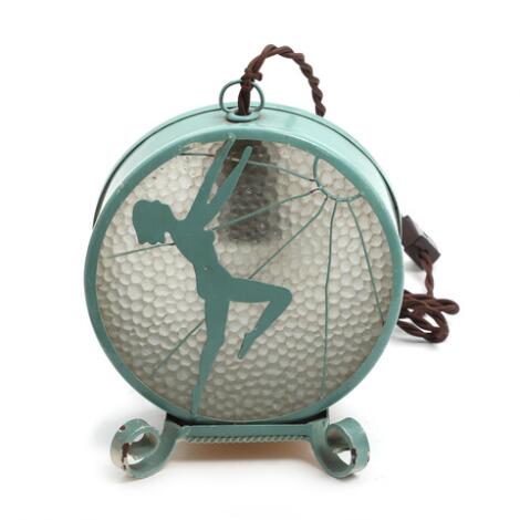 2545/712Scandinavian design: Art Deco table lamp of green painted metal, decorated with a posing woman and a deer in relief. 1940s. H. 22 cm.