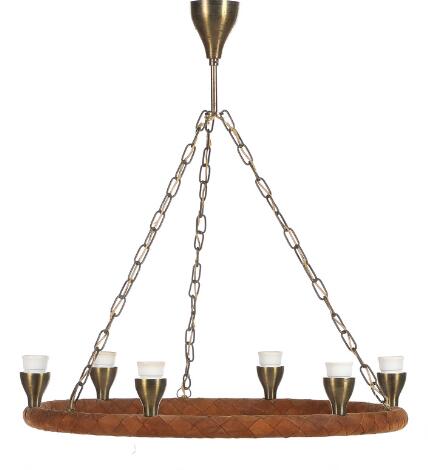 2545/740Danish design: A brass chandelier partly covered with brown leather. 1950-60s. H. 65. Diam. 60 cm.