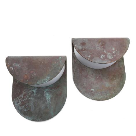 2545/623Pair of outdoor lamps of patinated copper with shades of white acrylic. 1960-70s. H. 28. W. 25. D. 9 cm. (2)