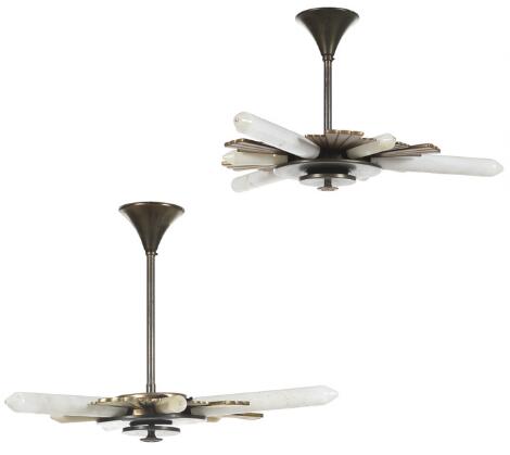 2545/617Fog & Mørup design: A pair of partly patinated brass star shaped ceiling lamps. Model E8655. Circa 1940. H. 40. Diam. 63 cm. (2)