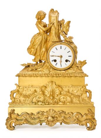 2547/357LyngbyFransk kaminur af forgyldt bronze, urhus med stånde pige ved træstub, skive af hvid emalje med sorte romertal. 19. årh.s midte. H. 40. B. 30. D. 12.