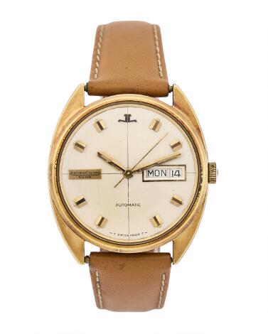 2547/2001LyngbyJaeger-LeCoultre: Club Day Date af guldbelagt stål, ref. E300706. Mekanisk værk med automatisk optræk samt dag- og datovisning, kaliber 1906. 1970’erne