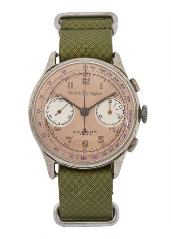 2547/2033LyngbyGirard-Perregaux: "Salmon Dial" af stål. Mekanisk kronografværk med manuelt optræk. 1950’erne.