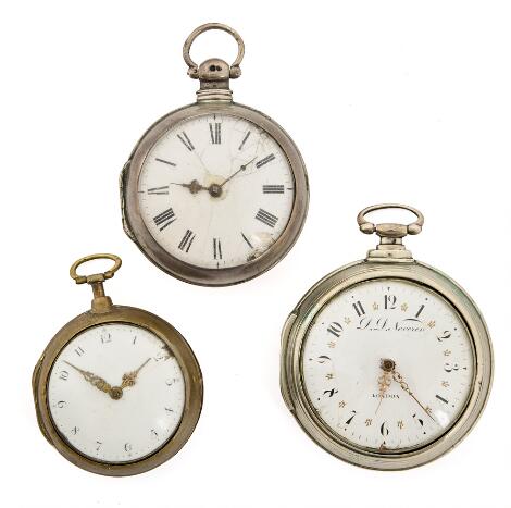 Three verge pocket watches in pair cases. Two in silver, one in brass. By Tho. Baker, D. D. Neveren, and John Banks, respectively. 1780s–1800s.