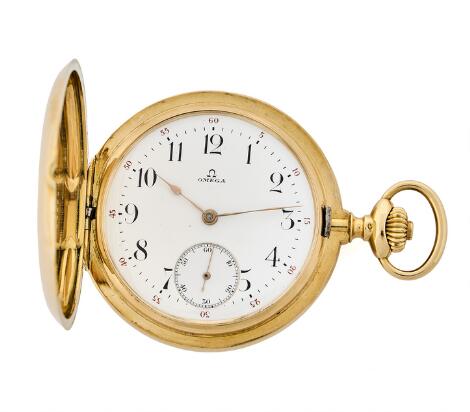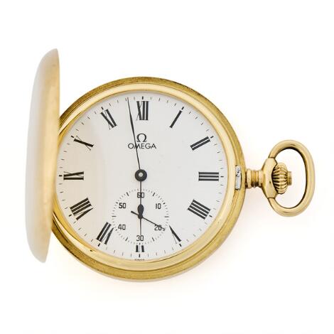 Omega: Hunter case pocket watch of 18k gold. Mechanical movement with lever escapement and crown winding.