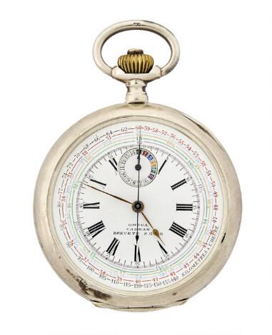 Omega: Chronograph pocket watch of silver. Mechanical movement with lever escapement and crown winding. 1906