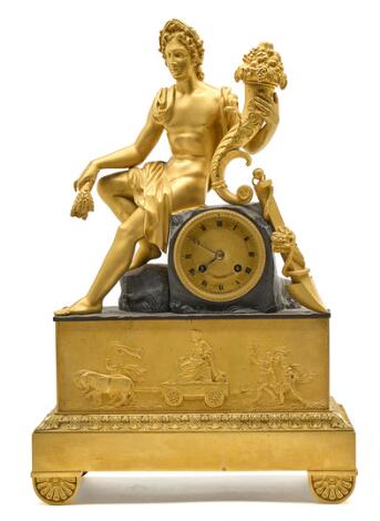 2550/131Fransk empire kaminur af forgyldt bronze med klassisk figur med lyre, forsølvet timekrans. 19. årh.s begyndelse. H. 39. B. 25. D. 9.