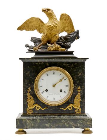 2549/29Fransk senempire kaminur. Skiven sign. Delinge, La Villers Cotterêts. Early 19th century. H. 50. B. 33. D. 14.