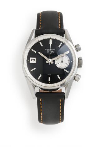 2550/2060LyngbyHeuer: Carrera "Albino" of steel, ref. 7753S. Mechanical chronograph movement with manual winding, cal. Valjoux 7750. 1970s.