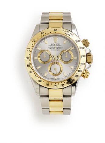 931/253LyngbyRolex: Daytona of 18k gold and steel, ref. 116523. Mechanical chronograph movement with automatic winding, cal. 4130. 2003–05.