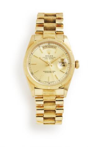 931/268LyngbyRolex: Day-Date "Bark" of 18k gold, ref. 18078. Mechanical movement with automatic winding, day and date indications, cal. 3055. 1987.