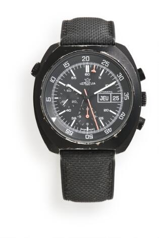 931/285LyngbyLemania: Wristwatch of PVD-coated steel, ref. 11004. Mechanical chronograph movement with automatic winding, day and date indications, cal. 5100. 1980s.