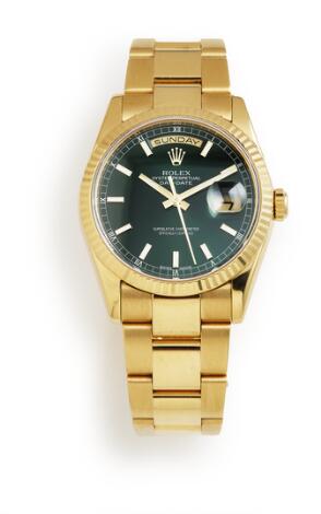 931/284LyngbyRolex: Day-Date of 18k gold, ref. 118238. Mechanical movement with automatic winding, day and date indications, cal. 3155. 2005 (sold 2006).