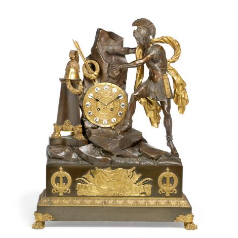 2551/3064LyngbyA large figural French mantel clock. Empire style, late 19th century. H. 66 cm. W. 52 cm. D. 22 cm.