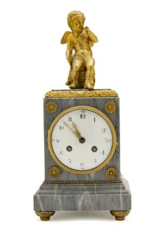 2551/3067LyngbyA French Louis XVI table clock of gray marble with gilded bronze figure, white enamel dial. Late 18th century. H. 33 cm. W. 15 cm. D. 13 cm.