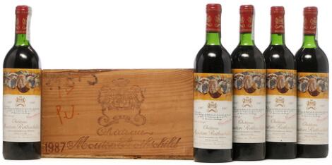 2548/3110Glostrup4 bts. Château Mouton Rothschild, Pauillac. 1. Cru Classé 1987 A-A/B (bn). Owc. etc. Total 10 bts.