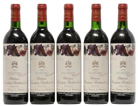 2548/3117Glostrup5 bts. Château Mouton Rothschild, Pauillac. 1. Cru Classé 1992 A-A/B (bn).