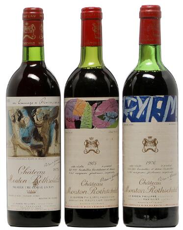 2548/3095Glostrup1 bt. Château Mouton Rothschild, Pauillac. 1. Cru Classé 1973 A-A/B (bn). etc. Total 3 bts.
