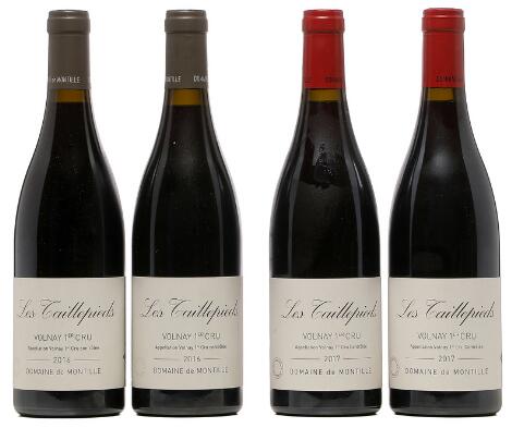 2 bts. Volnay 1. Cru "Les Taillepieds", Domaine de Montille 2016 A (hf/in). etc. Total 4 bts.
