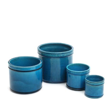Nils Kähler: Et sæt på fire urtepotteskjulere af stentøj, dekoreret med turkis glasur. Kähler. H. 9,7-19,4. (4)