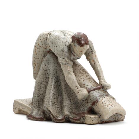 Hugo Liisberg: Skindgarver. Figur af stentøj, dekoreret med lys og brunlig glasur. Sign. monogram. Saxbo. H 21.