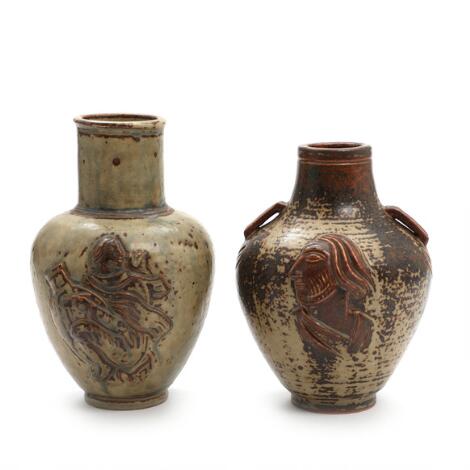 Jais Nielsen: To vaser af stentøj, modelleret med motiv i relief. Sign. Jais. Royal Copenhagen. H. 21 og 22,5. (2)
