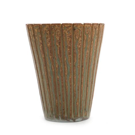 Arne Bang: Konisk vase af stentøj, modelleret med vertikale riller. Sign. monogram. H. 11,5. Diam. 9,5.