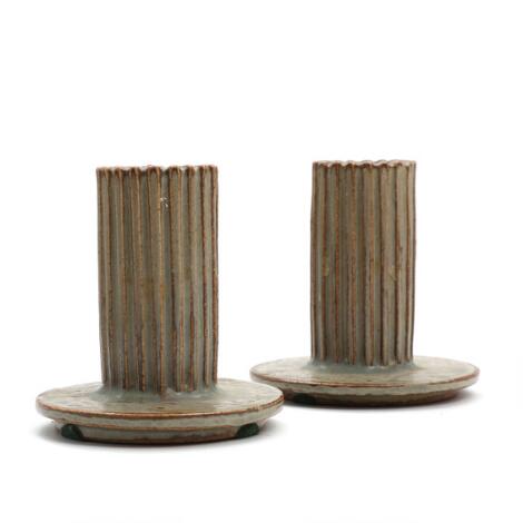 Arne Bang: Et par lysestager af stentøj, lystyller med vertikale riller. Dekoreret med beige glasur. H. 9,2. (2)
