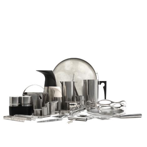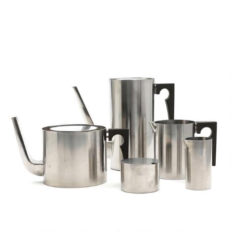 Arne Jacobsen: "Cylinda-line". Kaffe- og teservice af rustfrit stål. Udført hos Stelton. H. 5,5-20. (5)