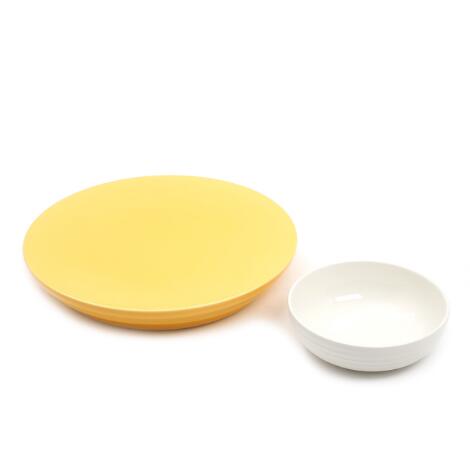 Ursula Munch-Petersen: Cirkulært kagefad og skål af fajance. Kgl. P., 428 og 574. Diam. 29 og 15. (2)