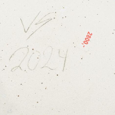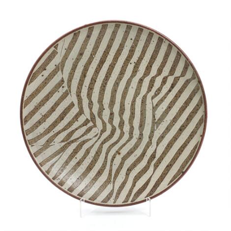 Janus Simmelsgaard: Rundt fad af stentøj. Dekoreret med grafisk komposition. Sign. JS 2024. Diam. 40.