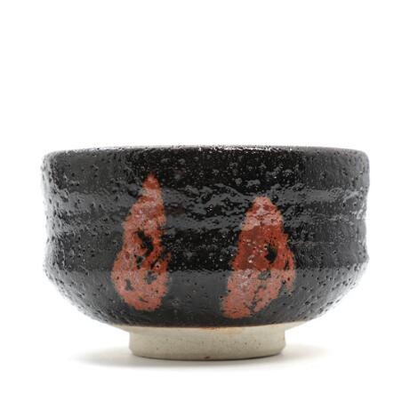 Shino yaki: Chawan teskål af stentøj. Dekoreret i sort glasur med to jernrøde penselstrøg, hi-iro. Diam. 12 cm.