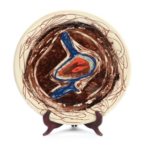 Peter Brandes: Cirkulært fad af lertøj, dekoreret med polykrome glasurer på lys bund. Stemplet PB. Tommerup Teglværk. Diam. 54.