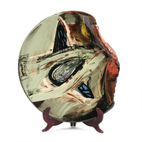 Peter Brandes: Fad af lertøj, dekoreret med polykrome glasurer. Stemplet PB-00-7. Tommerup Teglværk.