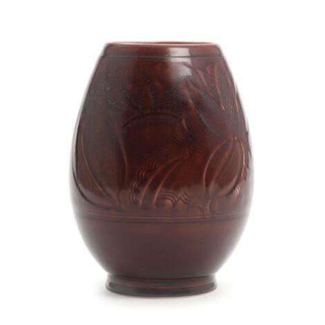 Gunnar Nylund: Art deco vase af stentøj, dekoreret med mørk brun glasur. Udføt hos B&G. 1930'erne. H. 32,5. L. 36.