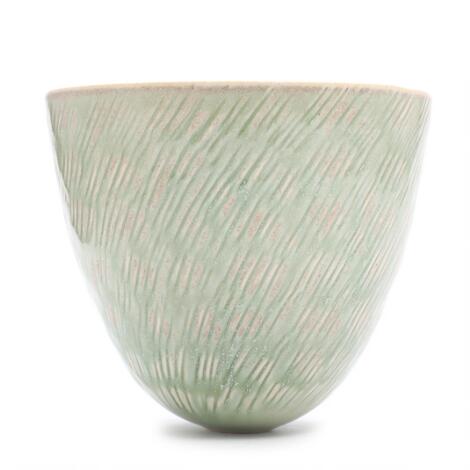 Gerd Hiort-Petersen: Rund vase af stentøj modelleret på øvre del med indridset dekor i relief. H. 12,8.