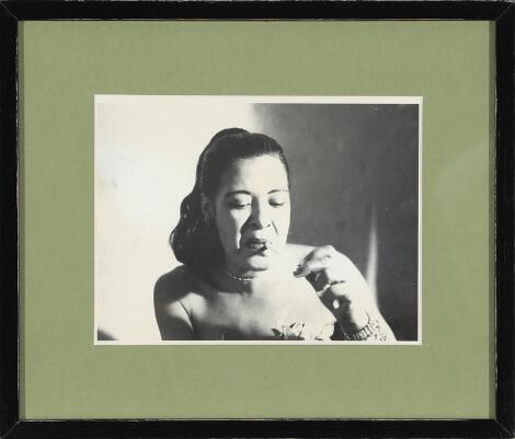 2549/254LyngbyOriginal black-and-white press photograph of American jazz singer Billie Holiday (1915-1959) lighting a cigarette