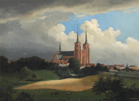 2549/316N. G. Rademacher: Scenery from Roskilde with a view of the Cathedral. Unsigned. Oil on canvas. 30 x 40 cm.