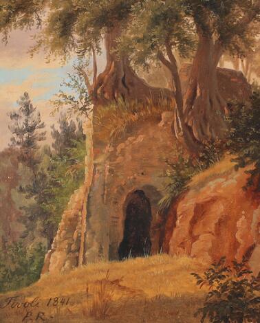 2549/318Peter Raadsig: Landscape from Tivoli, Italy in 1841. Signed P. R. Tivoli 1841. Oil on canvas. 27.5 × 23 cm.
