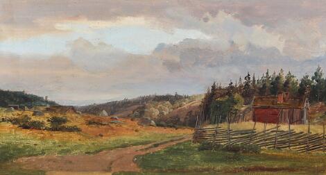 2549/321Artist unknown, 19th century: Landscape with fence and houses. Unsigned. Oil on canvas. 17.5 x 31 cm.